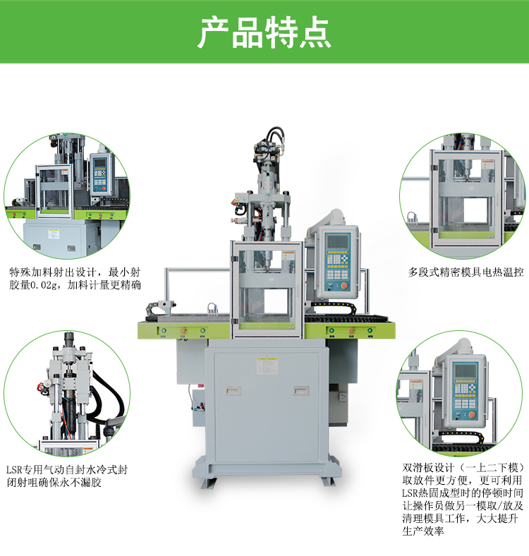 85噸 精密微量液態(tài)矽膠(jiāo)射出機的產品特點: